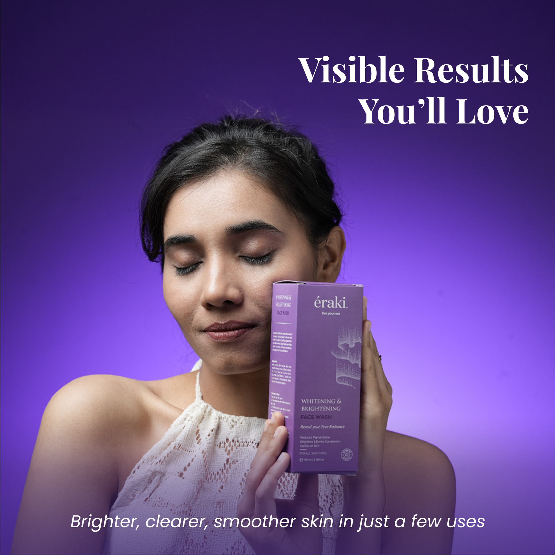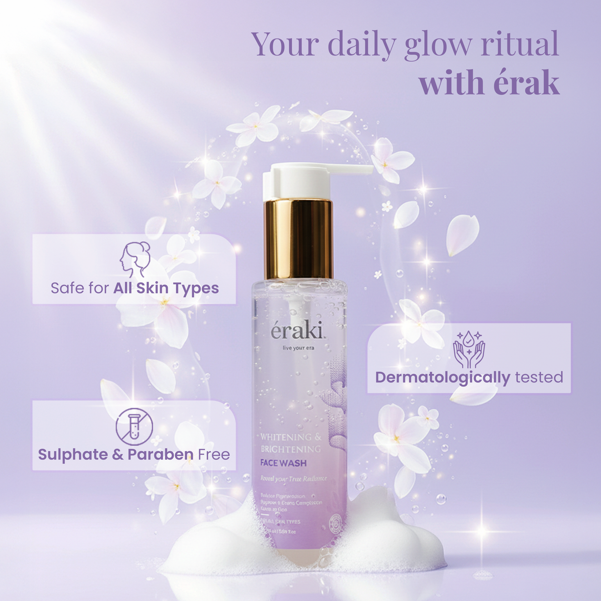 Discover clearer, brighter, and more luminous skin with éraki Whitening & Brightening Facewash — your everyday glow solution.